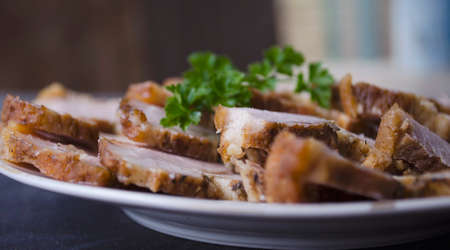 A beautiful close-up of roasted pork belly served on a plate, garnished with herbs and accompanied by a dipping sauce, highlighting its rich texture