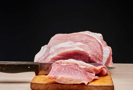 Raw Pork is prepared for Cook, It is on wood plate on black granite kitchen counter tabletop, shot by studio light. Clipping Paths.
