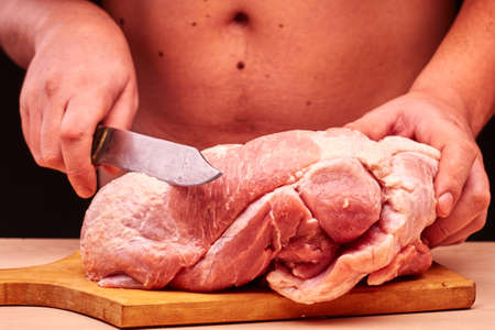 a large piece of raw pork meat chopped into pieces on a cutting board on an old rustic table black and stainless steel kitchen knife, close-up view from above. toned photo