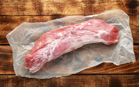 Raw fresh pork fillet butcher's cut on rustic wooden table.