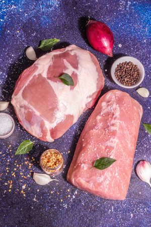 fresh pork cuts. Raw meat with spices. hind leg steak. Black background. Top view.