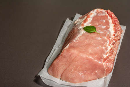 Raw pork loin with basil leaf. Large piece of meat, black stone concrete background. Trendy hard light, dark shadow, copy space