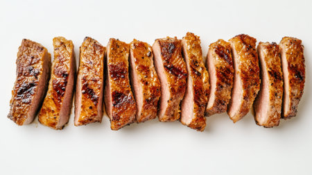 A succulent pork tenderloin sliced and arranged neatly, its golden-brown crust glistening against a clean white background.