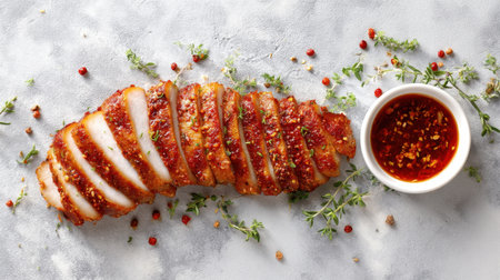 Savor the succulent slices of roast chicken breast drizzled with spicy chili sauce, artfully arranged with fresh herbs and spices on a textured gray surface.