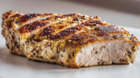 A beautifully grilled chicken breast with a flavorful herb marinade, displaying juicy meat texture, ideal for healthy dining, perfect for any meal occasion.