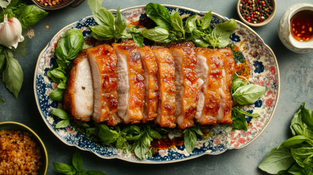 An artistic overhead shot of crispy pork belly served on a colorful platter, drizzled with fish sauce and accompanied by fresh herbs, creating an inviting presentation