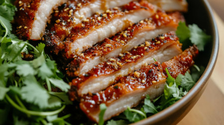 Enjoy a mouthwatering plate of crispy pork belly garnished with fresh herbs and sesame, perfect for any culinary enthusiast or special occasion.