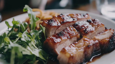 A beautifully presented plate of grilled pork accompanied by fresh greens, showcasing a delicious meal that appeals to food lovers and gourmets.