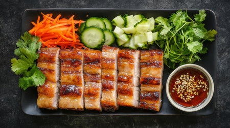A top-down view of a vibrant platter featuring crispy pork belly, accompanied by fresh vegetables and a small bowl of fish sauce for dipping, creating an appetizing display.