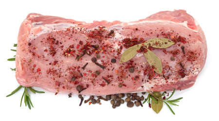 Raw pork slice with spice and herbs on white background