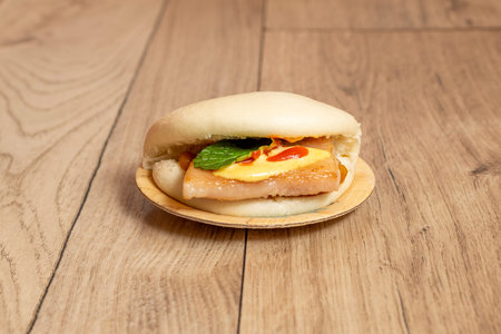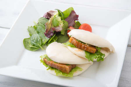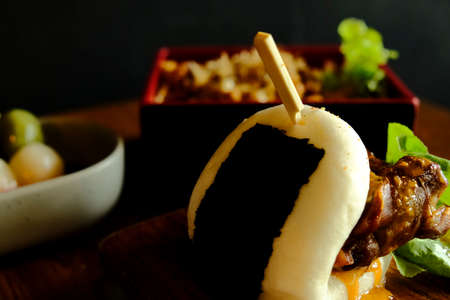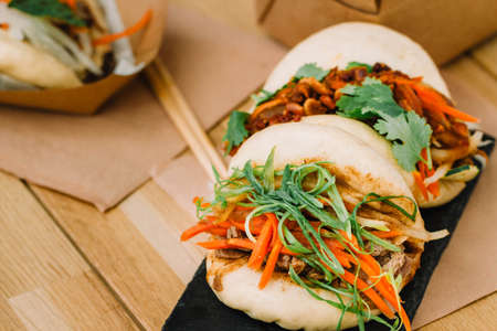 Selective focus Hirata Buns. Japanese traditional food. Asian cuisine made from steamed buns stuffed with salad and delicious savory fillings, sandwiches or tacos
