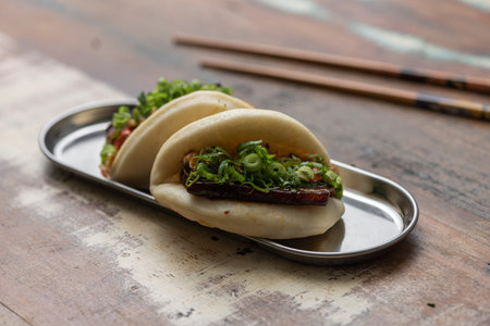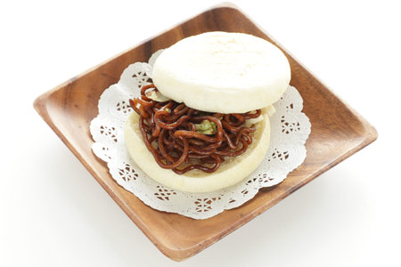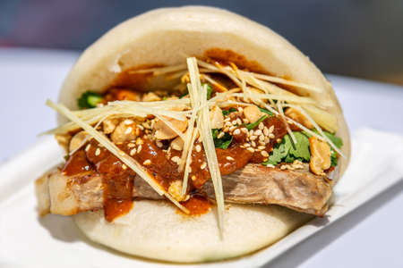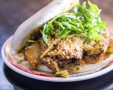 Taiwanese Gua Bao, Asian hamburger or sandwich from steamed rice bun with red-cooked pork belly, Popular street food in Singapore, Malaysia, Taiwan, China.