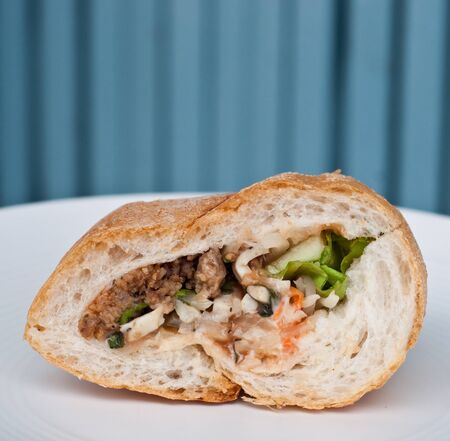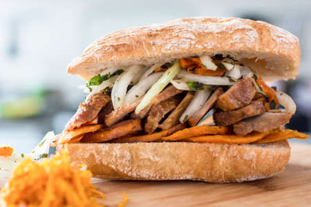 close up of a rustic vietnamese roast pork bahn mi sandwich