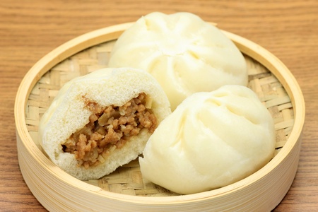 Steamed pork buns on wooden plate and bamboo steamer, Chinese dim sum