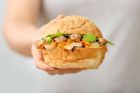 Hand holding gua bao, hirata buns, bao buns, guabao or baozi (traditional asian sandwich). Chinese food from Fuzhou, named Cha bao in Hong Kong and kakuni manju in Japan
