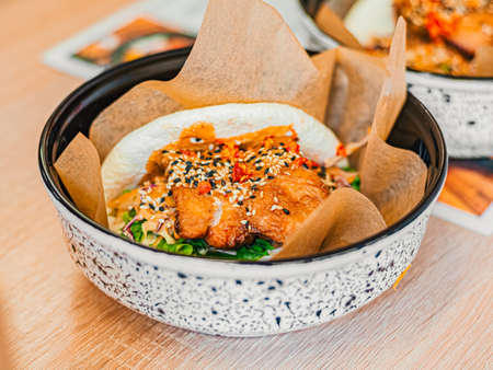Bao with chicken in paper in white plate. Rice bun with vegetable, meat filling with sauce, sprinkled with sesame seeds. Fast food in a cafe, restaurant.