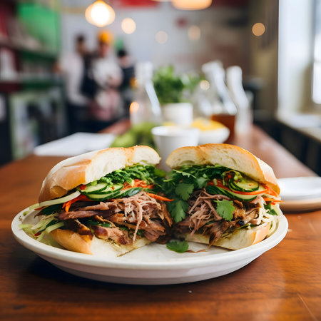 Two halves of a freshly made Vietnamese banh mi sandwich, featuring succulent pork, crunchy vegetables, and flavorful herbs.