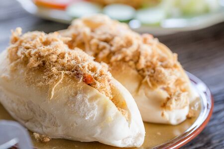 Steamed buns stuffed with minced pork and salted egg on wooden plate and fork, Asian food