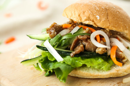 Roasted Pork Soft Bun with cucumber, onion, carrot and lettuce leaf isolated on table closeup side view