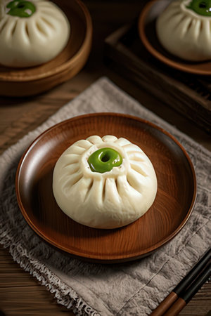 steamed dumpling - chinese bun on brown plate.