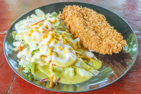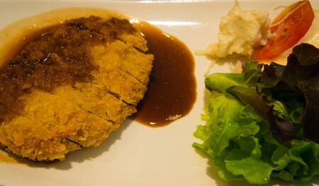 Japanese deep fried pork cutlet with soy sauce and vegetable salad.