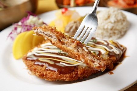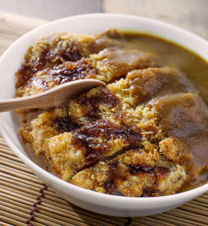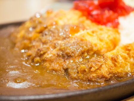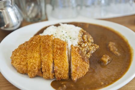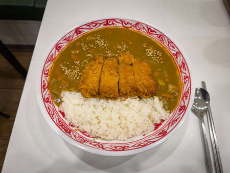 Japanese food, fried pork cutlet with curry sauce and rice in a restaurant