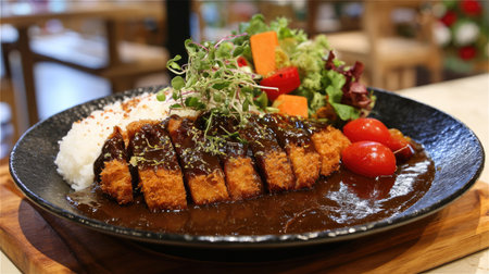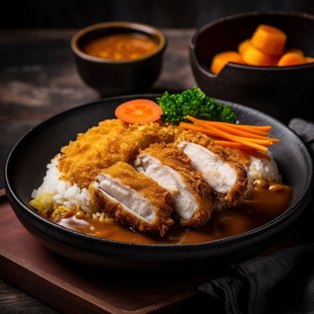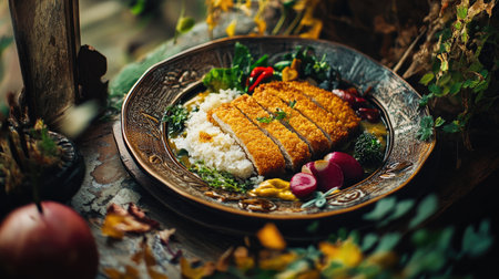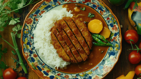 A vibrant plate of curry rice topped with a perfectly fried tonkatsu, surrounded by colorful garnishes, highlighting the delicious harmony of flavors in Japanese cuisine