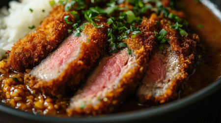 A close-up of crispy tonkatsu sliced open, revealing its juicy interior, served atop a bed of rich, aromatic curry rice, highlighting the dish's delicious textures