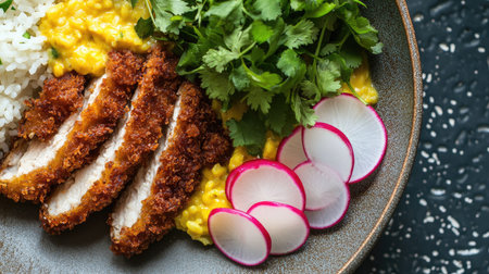 A delightful arrangement of curry rice and tonkatsu on a textured plate, garnished with sliced radishes and fresh herbs, inviting an aesthetic culinary experience