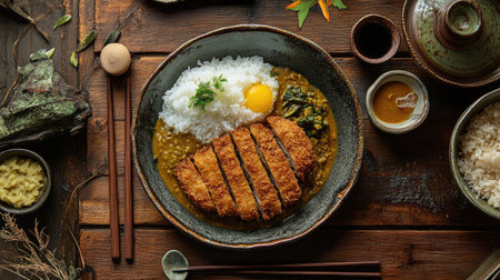 A beautiful plate of katsu curry featuring crispy pork cutlet, fresh salad, and a soft-boiled egg, served on a wooden table for an inviting meal.