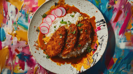 A vibrant plated dish featuring crispy breaded chicken served over white rice, garnished with fresh radishes and parsley, set against a colorful backdrop.
