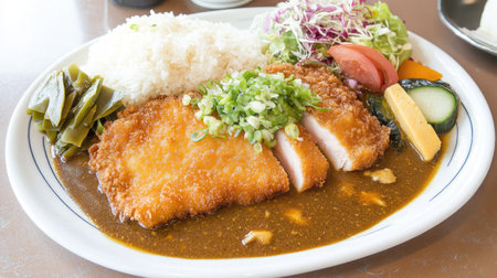 A vibrant plate featuring curry rice with a crispy fried cutlet, complemented by fresh vegetables. Perfect for illustrating delicious homemade meals.