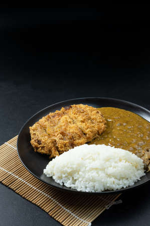 Tonkatsu Curry Rice (Japanese deep-fried pork cutlet with Curry rice). on black background.
