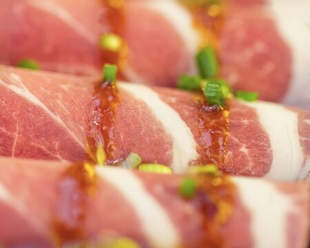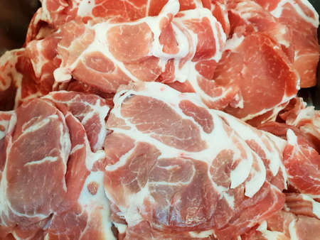 Top view of pork collar sliced as a background in the market for sale at Thailand, fresh meat for grill, Shabu
