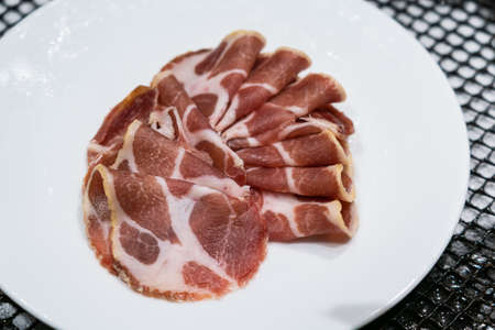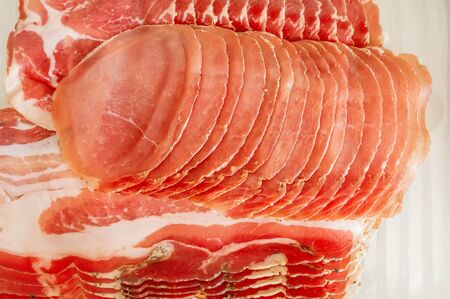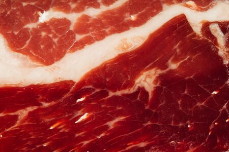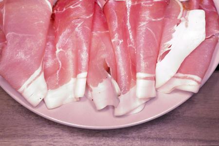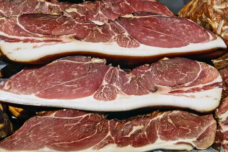 Raw sluggish Italian ham Prosciutto close-up, shallow depth of field