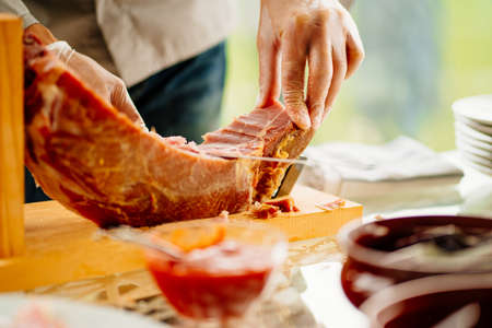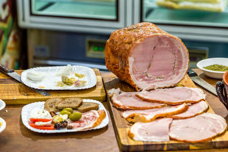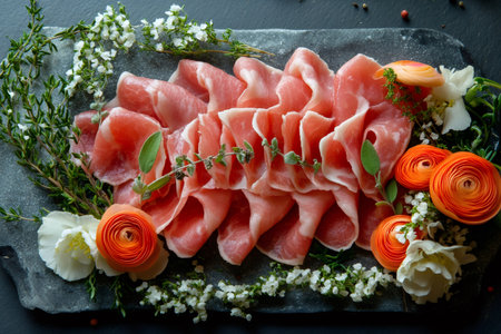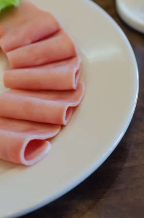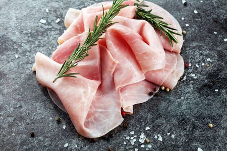 Sliced ham on wooden background. Fresh prosciutto. Pork ham sliced with rosemary