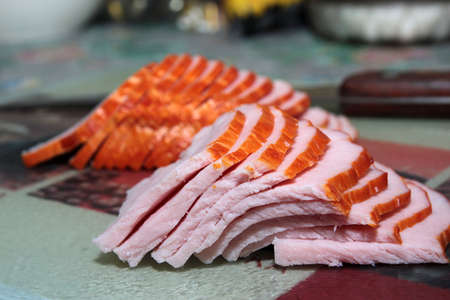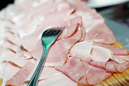 Meat, square ham sliced, protein for snacks. Sliced ham as a food background for your design