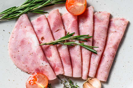 Sliced Pork ham. Fresh prosciutto. White background. Top view.