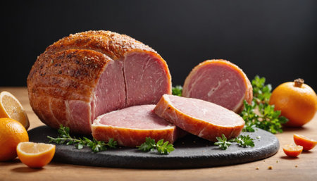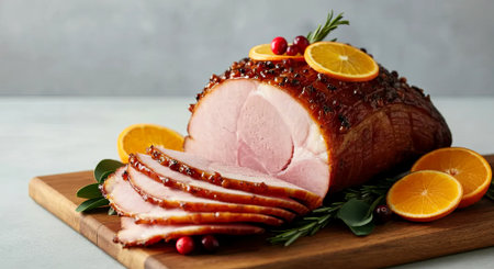 Savory holiday ham garnished with fresh oranges and cranberries on a wooden board. Perfect for festive feasts and family gatherings. Add flavor to your celebrations. Generated A.I.