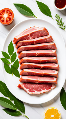 Fresh slices of bacon arranged on a plate with herbs and tomato.