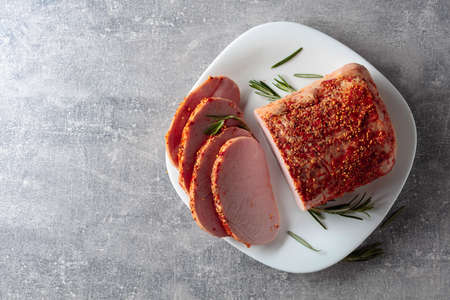 Spicy smoked ham with rosemary on a white plate. Top view.