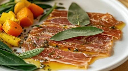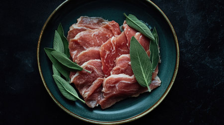 A vibrant presentation of Saltimbocca alla Romana, featuring thinly sliced meat adorned with fresh sage leaves, ideal for culinary enthusiasts and food photography.