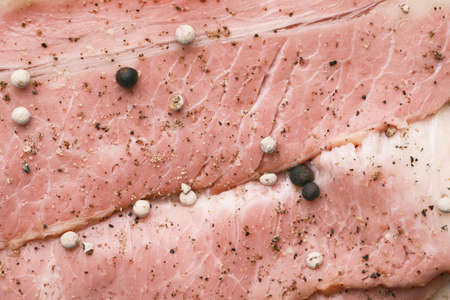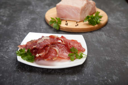 meat prepared marinated pork, pork meat products with lard sliced on the table