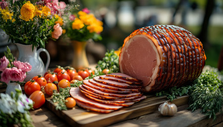 Delicious holiday ham served with fresh sides and festive decorations for a family gathering