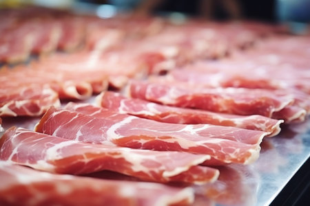 Meat processing plant. Slices of fresh bacon and mint slices on a conveyor belt in the workshop. Arrival of jamon or cold cuts. Production of pork or beef in a modern enterprise