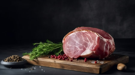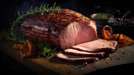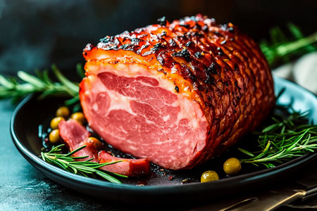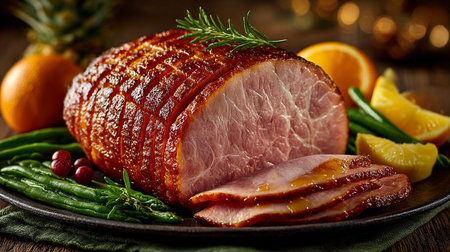 Glazed roasted ham garnished with rosemary and parsley on plate, festive warm lighting
