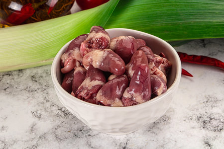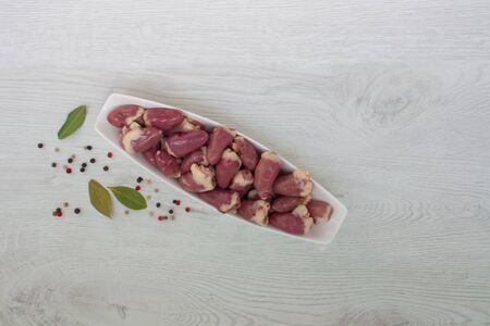 Raw uncooked chicken gizzards, (stomachs) on wooden background