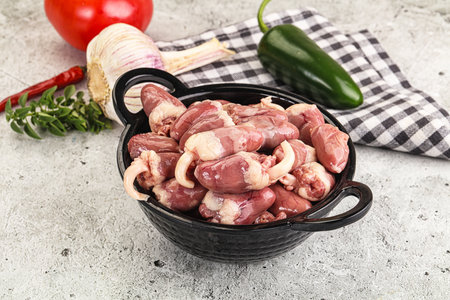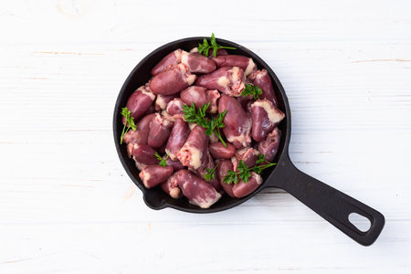 Fresh raw chicken offal arranged on a cutting board in kitchen setting, symbolizing poultry meat, food preparation, cooking ingredients and use in traditional cuisine and homemade meals