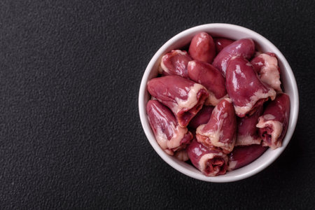 Fresh raw chicken, turkey or duck hearts on a ceramic plate with salt and spices on a dark concrete background