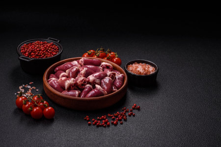 Raw chicken hearts with salt, spices and herbs on a dark concrete background